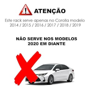 Rack De Teto Modelo Aço Corolla 15 A 19 Entre Portas Preto Especifico Rack de teto toyota corolla 2014 até 2019 - instalado entre portas Atenção: não serve no modelo novo do corolla, apenas até a versão 2019 Desenvolvido sob rigoroso controle de qualidade, cujo processo industrial, segue os padrões de segurança, com acompanhamento e supervisão técnica contínua, visando proporcionar ao consumidor, uma excelente alternativa no transporte de bagagens ou cargas. Instalado transversalmente entre a porta do veiculo de um lado para o outro . O rack possui encaixes perfeitos e ótimo acabamento. O kit de fixação recebe proteção e.V.A adesivo evitando que o mesmo venha a danificar a pintura ou deixar arranhões no teto. Descrição técnica: - projetado e desenvolvido para suportar até 35 kg de peso máximo, desde que distribuído de forma uniforme e equilibrada. - manual de instruções, para orientar a montagem, sua capacidade de transporte, regras de utilização e outros informes. - não amassa e nem risca o veículo - garras e suporte em ferro - não exige furações - fixação entre a portas do veículo. - fácil instalação - ótimo acabamento - excelente resistência Cor: Disponível na cor preto Aplicação: Montadora: toyota Modelo: corolla - 4 portas Conteudo da embalagem: 1 - rack dianteiro 1 - rack traseiro 1 - manual de instalação Importante: Não nos responsabilizamos pelo mal uso do produto e nem pela instalação. Procure um profissional especializado : 3 meses direto com o fabricante. Nosso horário de atendimento é de segunda a sexta das 9 as 17 horas excetos feriados . Boa compra... Atenção: as compras realizadas em nome de pessoa jurídica estão sujeitas à cobrança de icms, conforme protocolo icms 41, de 4 de abril de 2008. Caso você tenha dúvidas sobre o percentual a ser aplicado, consulte a cláusula segunda, 1 do referido protocolo. Marca: Não Informado