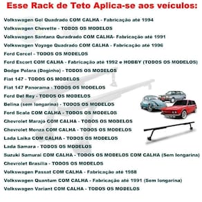 Rack teto vhip chevrolet monza com calha 1 elastico corda :: atenção:: Compatível com os modelos: Universal para carros antigos com calha A vhip desenvolveu esse rack sob rigoroso controle de qualidade, cujo processo industrial, segue os padrões de segurança, com acompanhamento e supervisão técnica contínua, visando proporcionar ao consumidor, uma excelente alternativa no transporte de bagagens ou cargas. Especificação técnica: Projetado e desenvolvido para suportar até 45 kg de peso máximo, desde que distribuído de forma uniforme e equilibrada; Manual de instruções, para orientar a montagem, sua capacidade de transporte, regras de utilização e outros informes; Não amassa e nem risca o veículo; Cor preto; Fabricado em aço; Não exige furações; Fixação na calha; Fácil instalação; Ótimo acabamento; Excelente resistência. Especificações técnicas: Fixação na calha Não amassa nem risca o veículo Suporta até 45kg de carga Garras e suportes em ferro tubular Cor preto Contém 2 peças Conteúdo da embalagem: 2 racks dianteiro + traseiro ; Kit instalação; Manual. Aplica-se aos veículos: Volkswagen gol quadrado com calha - fabricação até 1994 Volkswagen chevette - todos os modelos Volkswagen santana quradrado com calha- fabricação até 1991 Volkswagen voyage quadrado com calha - fabricação até 1996 Ford corcel - todos os modelos Ford escort com calha - fabricação até 1992 e hobby todos os modelos Dodge polara doginho - todos os modelos Fiat 147 - todos os modelos Fiat 147 panorama - todos os modelos Ford del rey - todos os modelos Belina sem longarina - todos os modelos Ford scala com calha - todos os modelos Chevrolet marajó com calha - todos os modelos Chevrolet monza com calha - todos os modelos Lada laika com calha - todos os modelos Lada samara - todos os modelos Suzuki samurai com calha - todos os modelos com calha sem longarina Chevrolet brasília - todos os modelos Volkswagen passat com calha - fabricação até 1988 Volkswagen quantum com calha - fabricação até 1991 sem longarina Volkswagen variant com calha - todos os modelos