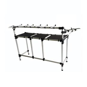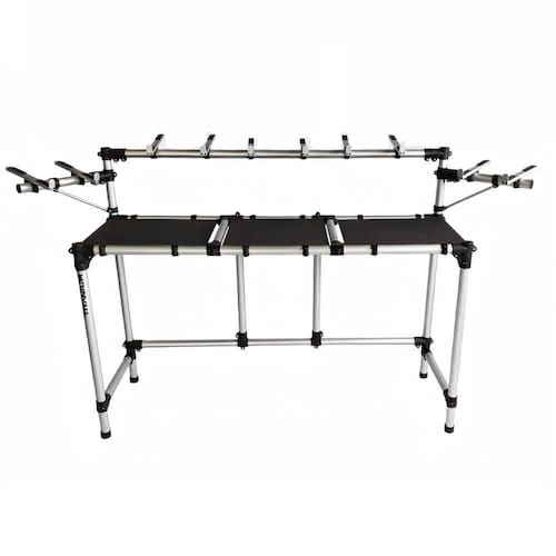 É um rackfabricado em alumínio, o que o torna leve para transporte,totalmente desmontável e resistente para suportar aparelhos pesados.Os Suportes são modulares podendo acomodar e adequar o seu equipamento da melhor forma e posição para sua performance de trabalho.