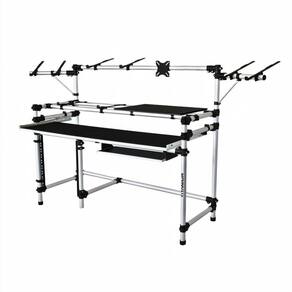 Possui gaveta telescópica retrátil para teclado controlador, monitor LCD no lado direito, e no lado esquerdo um suporte ideal para interface de áudio USB.