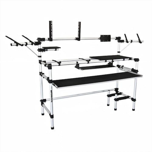 Nos cantos superiores é possivel acomodar um par de monitores de referência, e no centro periféricos 19".Possui gaveta telescópicas retrátil para teclado controlador, e, mais acima, uma superificie para acomodar teclado de computador, monitor LCD, e no lado direito e no lado esquerdo um suporte ideal para interface de áudio USB.