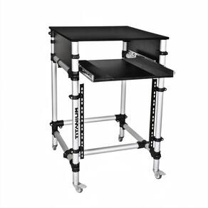 O Rack Titanium RT-90G é composto em alumínio e possui bandeja MDF com sistema de abertura em ângulopara melhor utilização, contando também com gaveta telescópica retrátil para mixer, mesa de som ou produto similar.