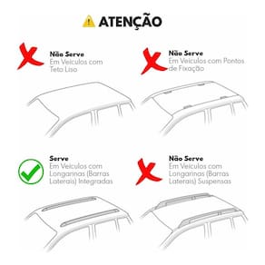 Observações importantes: Verifique a capacidade de carga do teto do seu carro no manual do proprietário do veículo. Respeite sempre a capacidade de carga estipulado no manual. As travessas poderão causar ruídos devido ao corte de vento, no entanto o perfil aerodinâmico desta travessa reduz consideravelmente, mas não o elimina. Não é caracterizado defeito no produto o eventual ruídos