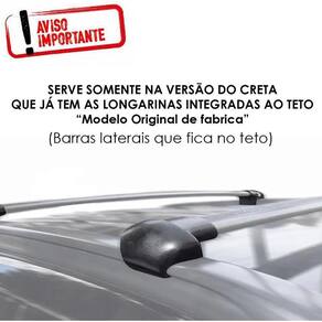 Rack Travessa De Teto Hyundai Creta 2017 A 2021 Cor Prata Prata Especifico Par de travessas de teto hyunday creta 2017 a 2021Não serve na versão pcdNão serve no novo creta 2022Fixado nas longarinas integradas barras laterais do teto.Cor disponível:- prataCompatível com todas as versões com longarinas integradas barras laterais :- creta 2017- creta 2018- creta 2019- creta 2020- creta 2021Sugestão de uso:Para transportar todo tipo de bagagem e equipamento esportivo. Podem ser utilizados como base para a instalação de outros acessórios, como bagageiros fechados ou abertos, suportes de bicicletas, pranchas de surf, escadas e etc.Observações importantes:Verifique a capacidade de carga do teto do seu carro no manual do proprietário do veículo. Respeite sempre a capacidade de carga estipulado no manual.As travessas poderão causar ruídos devido ao corte de vento, no entanto o perfil aerodinâmico desta travessa reduz consideravelmente, mas não o elimina. Não é caracterizado defeito no produto eventuais ruídosComposição do kit:- 2 travessas- kit de proteção à base de material eva para fixação nas ponteiras das travessas.- não acompanha ferramenta de aperto chave allen 5 Ficha-técnica:- material: alumínio ponteiras e perfil- 1 pino guia para o melhor travamento de cada ponteira.- design do perfil: aerodinâmico- medidas do perfil: 7 cm larg. X 2 cm alt.- pintura: eletrostática, super resistente- instalação: nas longarinas integradas já existente no teto do veículo- capacidade de carga: 45kg distribuídos verificar a capacidade de carga de seu veículo - borracha centralizada no perfil para maior aderência de sua bagagem- perfil reforçado internamente- sistema - t track - no perfil, facilita a instalação de acessórios.- perfil levemente arqueados para acompanhar curvatura do tetoImportante:Garantia de 1 ano por defeito de fabricação diretamente com o fabricante.Valor do par.Imagens meramente ilustrativas.Recomendamos que a instalação seja feita por profissional especializado e não nos responsabilizamos pelo mau uso do produto.Nosso horário de atendimento é de segunda a sexta das 9 as 17 horas exceto feriados .Boa compra...Atenção: as compras realizadas em nome de pessoa jurídica estão sujeitas à cobrança de icms, conforme protocolo icms 41, de 4 de abril de 2008. Caso você tenha dúvidas sobre o percentual a ser aplicado, consulte a cláusula segunda, 1 do referido protocolo.