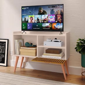Com um design inteligente, este rack é composto por dois nichos, ideais para acomodar tanto peças decorativas quanto equipamentos eletrônicos, proporcionando uma harmonia estética e funcional ao ambiente.