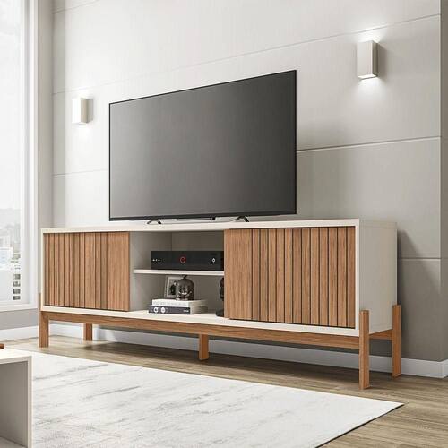 Rack Tv 72 Pol 180cm Bancada Ripado Para Sala Kellem Freijó/off White C01 - D'rossi Transforme sua sala com a elegância e funcionalidade do Rack TV 72 Pol 180cm Bancada Kellem na cor Freijó/Off White. Seu design moderno se destaca pelo acabamento ripado em baixo relevo nas portas deslizantes, que conferem sofisticação e um visual contemporâneo. Os pés em estilo cavalete com 18mm de espessura trazem charme e robustez ao móvel. Fabricado com materiais de alta qualidade, como MDP e MDF, o rack recebe acabamento em pintura UV o que proporciona maior durabilidade e resistência ao uso diário. Funcional e bem distribuído, ele conta com 2 portas de correr com puxadores embutidos, 1 prateleira e 2 nichos internos, ideais para acomodar aparelhos eletrônicos e itens decorativos. O passa-fios integrado facilita a organização dos cabos, mantendo o visual organizado. O Kellem é deal para quem deseja unir praticidade, design e qualidade em um único móvel. Dimensões do Produto: Altura: 63 cm Largura: 181 cm Profundidade: 36 cm Peso: 29 kg Especificações do Produto: Material da Estrutura: MDP18mm, MD15mm, HDmm 3mm Acabamento: Pintura UV Escala de Brilho: Fosco Suporta TV de até: 72 Polegadas Peso Suportado: 63 Kg Distribuídos Possui Portas: Sim Quantidade de Portas: 2 Portas Tipo de Porta: Deslizantes Tipo do Trilho: Plástico Possui Puxador: Sim Tipo de Puxador: Embutido Possui Prateleiras: Sim Quantidade de Prateleiras: 1 Praleteira Possui Nichos: Sim Quantidade de Nichos: 2 Nichos Possui Gavetas: Não possui Possui Passa Fio: Sim Possui Pés: Sim Tipo de Pés: Cavalete Diferenciais: Design sofisticado; Portas ripadas em baixo relevo; Pés estilo cavalete com 18mm de espessura. Sistema de montagem: Parafusos/Cavilhas/Minifix Manual de Montagem: Sim Complexidade da Montagem: Média Montagem: Recomendamos que seja feita por um profissional Garantia: 90 dias contra defeito de fabricação Instruções de Limpeza: Utilizar um pano limpo e levemente úmido Quantidade de Volumes: 1 Caixa Medida das Embalagens Caixa 1: 186,3x43,7x8,4cm Entrega: É feita somente até o térreo ou portaria. Confira sempre as medidas das embalagens para assegurar que o produto passe por portas e escadas do local.