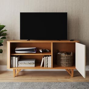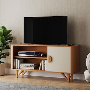 Produzido em MDF, acomoda TVs de até 50 polegadas e conta com porta com dobradiças metálicas, puxador em madeira, prateleira e dois nichos para organizar eletrônicos e objetos decorativos.