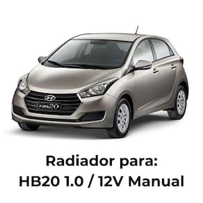 Radiador de Água HB20 1.0/1.6 Manual O Radiador de Água é a solução ideal para o sistema de arrefecimento do Hyundai HB20. Projetado com encaixe sob medida e acabamento de alta qualidade, garante máxima eficiência de resfriamento, proteção ao motor e melhor desempenho do ar-condicionado, mesmo em condições severas de uso. Características Principais -compatibilidade garantida: instalação fácil, sem adaptações. -material de alta qualidade: construído em alumínio de grau superior, resistente à corrosão. -desempenho superior: fluxo de ar otimizado e excelente dissipação de calor. -durabilidade e confiabilidade: estrutura robusta, longa vida útil e proteção contra vazamentos. -medidas: 510 x 406 x 16 mm. -transmissão: Câmbio Manual. -aplicação: Veículos com ar-condicionado. Aplicações Compatíveis -hb20 Confort 1.0 12V / 1.6 16V - 2012 a 2015 -hb20 Confort Plus 1.0 12V / 1.6 16V - 2012 a 2015 -hb20 Confort Style 1.0 12V / 1.6 16V - 2012 a 2015 -hb20 FIFA 1.0 12V / 1.6 16V - 2012 a 2015 -hb20 For You 1.0 12V - 2012 a 2015 -hb20 Premium 1.6 16V - 2012 a 2015 -hb20 R Spec 1.6 16V - 2012 a 2017 -hb20 Spicy 1.0 12V / 1.6 16V - 2012 a 2015 Benefícios para o Motor -proteção completa contra superaquecimento. -economia de combustível, mantendo a temperatura ideal. -maior conforto térmico, com melhor desempenho do ar-condicionado. -confiança e segurança: produto de marca reconhecida com suporte e .