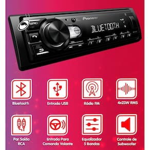 Rádio Pioneer Mvh-S235Bt Som Automotivo Usb Bluetooth 4 Canais Descrição: O mvh-s235bt é resultado da combinação dos melhores recursos das gerações anteriores de sucesso como o mvh-s218bt, mvh-s118ui e mvh-98ub. Com a tecnologia bluetooth você pode curtir as suas músicas e podcasts favoritos pelos aplicativos de celulares e realizar chamada telefônica hands-free. Agora, se você é daqueles que prefere ouvir músicas por pendrive ou rádio fm, o aparelho também oferece esses recursos. Um dos grandes diferenciais deste modelo é a incrível qualidade sonora, equalizador de 5-bandas, corte de frequências, função bass boost reforço de graves e um som muito mais potente. Sim, trata-se da famosa qualidade de som pioneer Por fim, para atender aos pedidos dos consumidores, foi adicionado ao modelo a entrada de comando de volante. Com isso, o aparelho se torna muito versátil nas aplicações.