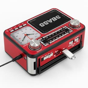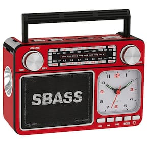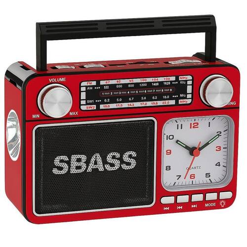 Rádio Portátil Recarregável Bluetooth SBASS com Relógio, USB, TF e AM/FM - Vermelho O Rádio Portátil SBASS é a escolha ideal para quem busca estilo retrô, funcionalidade e versatilidade em um único produto. Com design clássico amadeirado e alça para transporte, ele combina modernidade com um visual vintage que dá um charme especial ao ambiente. Equipado com Bluetooth, ele permite conexão sem fio com celulares, tablets e notebooks para reprodução de músicas. Também conta com entrada USB e slot para cartão TF microSD , possibilitando tocar arquivos MP3 diretamente. O rádio possui sintonia para FM, AM e SW, garantindo acesso a uma ampla variedade de estações. Seu relógio ógico integrado traz ainda mais praticidade ao dia a dia. Pode ser com bateria recarregável inclusa ou com pilhas não inclusas , ideal para uso em casa, no trabalho, viagens ou acampamentos. Possui lanterna potente na parte lateral, ideal para acampamentos. Especificações Técnicas Conectividade: Bluetooth para conexão com dispositivos móveis Entradas: USB, cartão TF microSD para reprodução de MP3 RMS: 3.0-polegadas Alto-Falante 4 ohms 3W Bandas de rádio: FM / AM / SW Alimentação: bateria recarregável inclusa ou pilhas não inclusas Alto-falante integrado com som claro e boa potência Relógio ógico de quartzo integrado Função lanterna lateral embutida Controles frontais de volume, sintonia e funções Alça para transporte Design retrô com acabamento amadeirado AC/DC Alimentação AC: 110V/220V DC: 3V UM-1x2 PCS Bateria Não Inclusa Faixa de Frequencia FM: 87108MHz AM: 5221620KHzz SW1-2: 3.222.0MH Diferenciais do Produto Combina rádio, caixa de som Bluetooth, relógio e lanterna em um só equipamento Portátil, leve e fácil de transportar Ideal para ambientes internos e externos Visual clássico que combina com qualquer ambiente Itens Inclusos 1x Rádio Portátil Recarregável 1xcabo de Energia 1x Alça para Transporte Código de Homologação Anatel: 005491708855 Marca: Não Informado