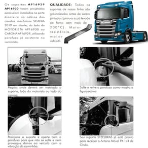 Itens Inclusos: 01 Rádio PX 80 Canais RP-50 01 Microfone PTT 01 Suporte para Rádio 01 Kit de Instalação 01 Manual de Instalação 01 Antena Mini Argentina Black Viuva Negra B-2009P 01 Suporte Dianteiro Scania StreamLine Lado Motorista 01 Kit de Parafusos Anti-Furto Ean: 7792380501125