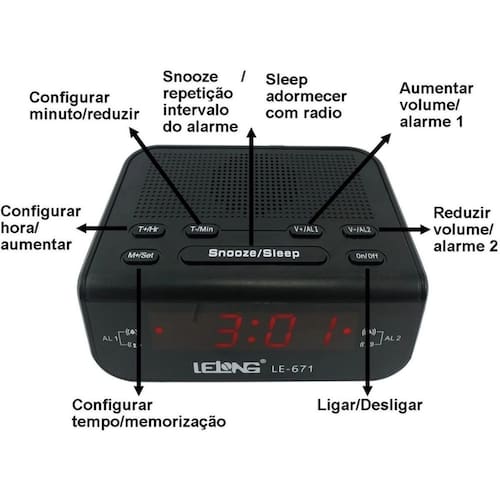 Rádio Relógio Digital Despertador Alarme Duplo Lelong Le-671 Relógio Despertador Digital Elétrico De Mesa Radio Am FmFácil de utilizar Definição simples do relógio para configurar a hora e o alarme sem necessitar de instruções- Regulagem de luminosidade Acorde ao som da sua estação de rádio favorita ou de um alarme Temporizador para adormecer ao som da sua música favorita Repetição do alarme para dormir mais um pouco Pilha de reserva assegura a conservação da memória da hora durante falhas de energiaO visor amplo permite uma fácil leitura do conteúdo no ecrã. Agora, pode ver as horas e o alarme facilmente, mesmo à distância. Ideal para pessoas de idade mais avançada ou com problemas de visão.Sintonizador FM/MWSintonizador estéreo FM/MW AM Definição simples do relógioA hora e o alarme são tão fáceis de configurar que provavelmente nem será necessário consultar o Manual de início rápido ou as Instruções de utilização. Basta observar os botões do rádio relógio para definir a hora e o alarme.Acorde com o rádio ou aviso sonoroDesperte ao som da sua estação de rádio favorita ou de um sinal sonoro. Defina o alarme no seu rádio relógio Lelong para acordar com a estação de rádio que ouviu por último ou escolha acordar com um sinal sonoro. Quando chegar a hora de despertar, o rádio relógioAlarme duploO sistema de áudio inclui duas horas de alarme diferentes. Defina uma hora de alarme para o acordar e outra hora de alarme para acordar outra pessoa.Repetir AlarmePara evitar que adormeça e se atrase, função de repetição do alarme. Se o alarme tocar e quiser dormir mais um pouco, basta premir uma vez o botão de repetição do alarme e voltar a dormir. Nove minutos depois o alarme volta a tocar. Pode continuar a premir o botão de repetição do alarme a cada nove minutos até o desligar totalmente.Temporizadoro temporizador permite-lhe decidir durante quanto tempo pretende ouvir música - ou uma estação de rádio à sua escolha - antes de adormecer. Basta definir um limite de tempo até 1 hora e escolher uma estação de rádio para ouvir enquanto adormece. Homologação Anatel: 025391003883