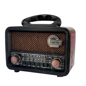 Código de barras: 7891123113103 Homologação Anatel: 169902214103 Rádio Retro 3W Bluetooth 5.1 com Lanterna Marca: Eletromex Este é um rádio estilo retrô, com Bluetooth, entrada para Pen drive e de memória. Ele é construído em matérias de alta qualidade, gerando um ótimo acabamento. Possui uma ótima captação de rádio AM/FM. Pode ser diretamente na tomada 110/220v, ou fora dela, com sua bateria recarregável de ótima autonomia. Descriçaõ técnica: - Tensão de saída: DC 3V - Potencia: 3W - Bateria Interna Recarregável - Tempo de Recarga: 8 Horas - Taxa de Ruído: 36dB - Bateria: 1200mAh - Frequência FM: 88-108 MHz - Sensibilidade FM: 15dB + 55dB - Taxa de Ruído FM: 45dB - Frequência AM: 530 1600 KHz - Frequência SW: 5.9 18.0 MHz - Entrada Para SD - Entrada USB - Com Lanterna de LED - 3 Bandas Itens Inclusos: - 01 Rádio Portátil - 01 Cabo de alimentação - 01 Manual de instruções Disponível nas cores: -Bege -Preto -Dourado Medidas da embalagem: L: 12,0 x C: 21,5 x A: 18,0cm Peso do Produto: 715g **Informar as cores desejadas no campo Observações