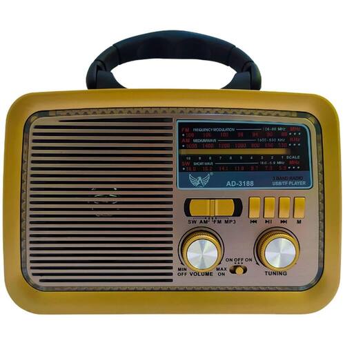 Informações adicionais: - Marca: Altomex - Modelo: AD-3188 - Potência: 5W - Conexões: Usb, Micro Sd, Aux, Bluetooth - Com Led azul e lanterna - Medidas da embalagem A x L x C : 11 x 18 x 22 cm - Peso do rádio: 934 gramas - Alimentação: AC/DC - Certificado de Homologação da ANATEL Número 179132114193