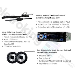 • 01 Auto Rádio Roadstar RS2714BR PLUS • 01 Controle Remoto • 01 Chicotes Para Instalação • 01 Par de Alto Falantes 6" Bomber • 01 Antena Interna Stetsom Universal Eletrônica Amplificada ST900 - Blister • Manual e Certificado de Garantia