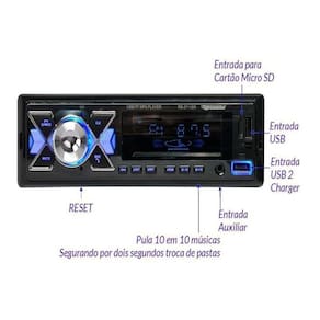 • Painel: Fixo com Botões na Cor Azul • Visor: LED Branco • Rádio: FM com Memória para 18 Estações FM • Controles: Graves, Agudos e Balanço dos Canais • Conexões: Bluetooth • Entradas: Micro SD, Auxiliar e 2 USB´s (1 Charger e 1 Player) • Saídas: 4 RCA • Tipo de Conector: ISO • Controle Remoto: SIM (Físico e por Aplicativo) • Potência: 4 Canais de 55 Watts RMS • Medidas Aproximadas (LxAxP): 18cm Largura x 10,5 Profundidade x 5cm Altur