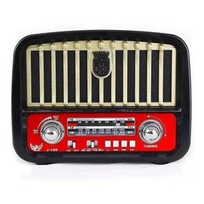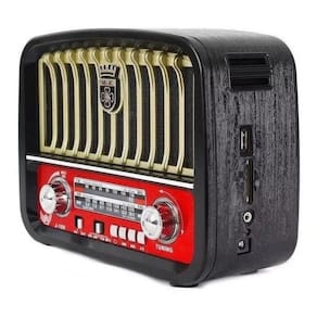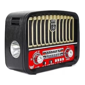 Rádio Retrô Portátil com entrada USB e Cartão SD, lanterna e AM/FM com bateria recarregável.
