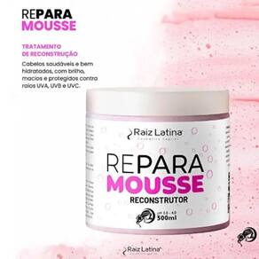 Raiz Latina Máscara Reconstrutora Repara Mousse 500ml Raiz Latina Mousse Reparador 500ml é um mousse reparador denso que doa controle, volume extra e encorpa os fios. Sua ação com proteção uv ajuda a proteger contra os danos causados pelos raios solares ao mesmo tempo em que promove uma fixação reforçada, sem deixar resíduos e fácil de remover para um penteado suave, brilhante e perfeito. Marca: Não Informado
