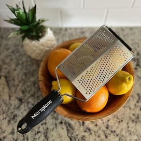 Ralador Duplo Fino E Grosso Gourmet Series Microplane Preto Os raladores Microplane unem alta performance e design ergonômico. Com lâminas ultra afiadas de aço inox fabricadas nos EUA, oferecem cortes precisos para raspas delicadas ou mais grossas, ideais para frutas, queijos, legumes e especiarias.Seu cabo confortável e base antiderrapante garantem uso estável e seguro. Além disso, vêm com tampa protetora reutilizável e podem ser lavados na lava-louças, facilitando a limpeza. Perfeitos para chefs e amantes da culinária, trazem qualidade e praticidade para o dia a dia na cozinha.Especificações do produto: - Lâmina dupla: fina para raspas delicadas e grossa para ingredientes volumosos- Ideal para queijos, especiarias, vegetais e frutas- Cabo ergonômico para maior conforto durante o uso- Inclui tampa protetora para armazenamento seguro- Pode ir na lava-louçasFicha técnica: - Código: 4082740097- Marca: Microplane- Modelo: Gourmet Series- Conteúdo da Embalagem: 1 Ralador- Material: Aço Inox- Peso: 0,210kg- Dimensões do produto: 3cm x 11,5cm x 33,3cm (AxLxP)- Garantia: 3 Meses (Contra defeito de fabricação) Altura - 3cm Largura - 11,5cm Profundidade - 33,3cm Peso - 0,210kg Sobre a Marca - A americana Microplane é uma marca mundialmente reconhecida por seus raladores de alta qualidade e precisão. Seus produtos são conhecidos por sua durabilidade, design ergonômico e lâminas afiadas que permitem ralar facilmente uma variedade de alimentos, como queijo, frutas, legumes e chocolate. A marca Microplane oferece uma ampla gama de raladores, desde os clássicos de mão até os modelos mais especializados, tornando-se uma escolha popular entre chefs e amantes da culinária.