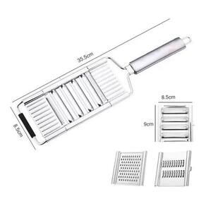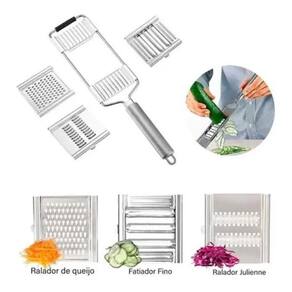 Ralador em Aço Inox com Cabo e 3 Lâminas Intercambiáveis - Uny HomeRevolução na cozinha O ralador é indispensável em qualquer cozinha, seja para fatiar bem fininho e fazer batatas e outros vegetais na forma chips, ralar em diferentes graus e tamanhos e assim ter uma infinidade de pratos e saladas bem coloridas e variadas, para uma mesa digna de reis. O ralador é feito em aço inoxidável para lâminas mais precisas e duráveis, com cabo anatômico para maior conforto e 3 lâminas intercambiáveis.Código do Produto: UD200119Material: Aço InoxAltura: 36 cmComprimento: 8,5 cmTamanho de Cada Lâmina: 8,5x9 cmItens Inclusos: 01 Ralador Multifuncional e 3 lâminas Diferentes