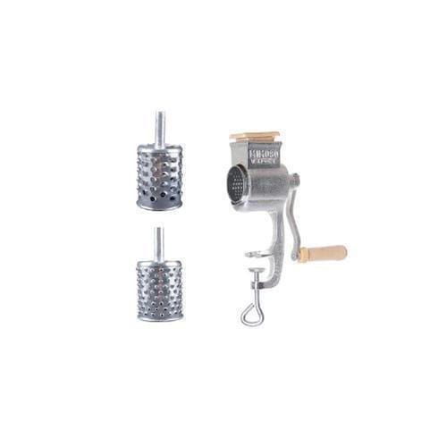 Material: ferro fundido com acabamento estanhado conjunto multiuso formado por: Corpo com bucha plastica e parafuso fixado, 2 tipos de ralos filete e lascas , taco embolo e porca tipo borboleta para fixação da manivela de comprimento 14 cm com cabo PLASTICO. Utilizado: rala coco, queijos, legumes, sabão caseiro pedra e outros. Capacidade 72 a 87 giros para produção de 500 gramas de queijo ralado Abertura de ENTRADA 4,5 x 5,5 cm.
