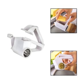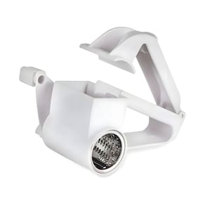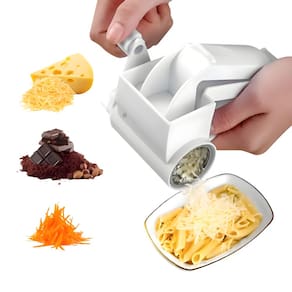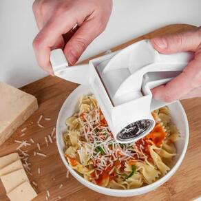 Ralador manual com manivela, lâmina em inox e corpo em plástico resistente. Ideal para queijos, chocolates e legumes.Base recarregável
