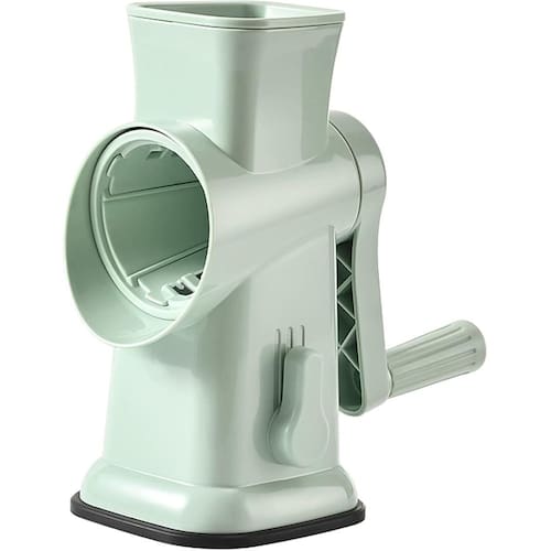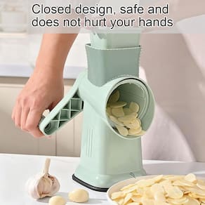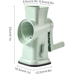Material: ABS+aço inoxidável Cor: verde Tamanho da embalagem: 28 × 18 × 16 cm Peso da embalagem: 1,2 kg Lista de embalagem: 1 x cortador rotativo de vegetais 6 x lâminas de tambor 6 lâminas intercambiáveis para corte versátil: este cortador rotativo de vegetais inclui seis lâminas de tambor de aço inoxidável para fatiar, triturar e ralar queijo, batatas, cenouras, pepinos, nozes e muito mais com facilidade. Operação sem esforço com manivela: o design ergonômico da manivela permite uma preparação suave e rápida de alimentos. Basta girar a alça para ralar ou fatiar os ingredientes rapidamente, economizando tempo e esforço na cozinha. Design seguro e fácil de usar: os ingredientes são inseridos pela calha de alimentação superior, mantendo as mãos afastadas das lâminas. O sistema de corte fechado melhora a segurança em comparação com os raladores tradicionais. Base antiderrapante estável: a base robusta com design de sucção mantém o cortador firmemente preso à bancada durante a operação, garantindo um uso estável enquanto reduz o movimento e melhora a eficiência de corte. Fácil de desmontar e limpar: as lâminas removíveis do tambor e a estrutura simples permitem uma limpeza rápida em água corrente. O design compacto facilita o armazenamento em armários ou gavetas de cozinha.