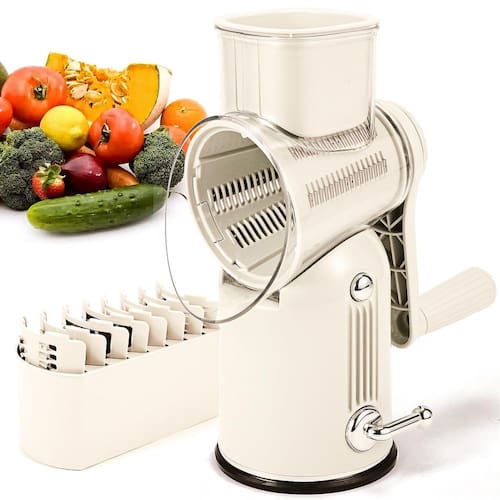 - Operação e limpeza convenientes: todas as partes do nosso ralador de queijo rotativo 5 em 1 podem ser facilmente montadas e desmontadas, sem mais problemas de limpeza e esfrega, o mais importante é que a lâmina possa ser completamente desmontada, basta enxaguar com água limpa. A caixa de armazenamento incluída também pode armazenar bem as lâminas para manter sua bancada limpa e arrumada. Observe que não deve ser colocado na máquina de lavar louça para evitar danos causados pelo calor