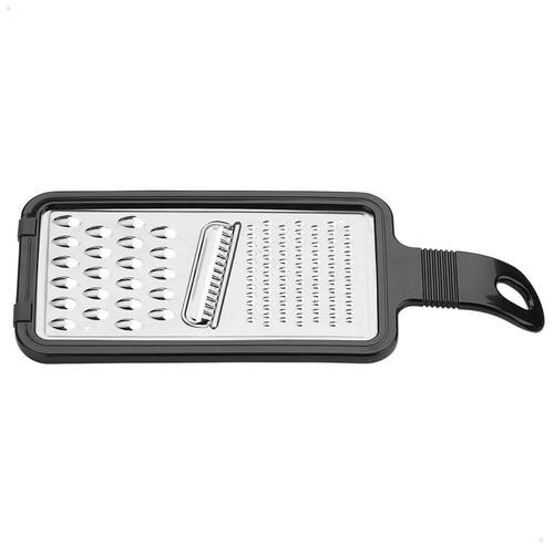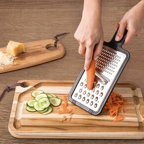 INFORMAÇÕES DO RALADOR UNIVERSAL - Lâmina de aço inox com três diferentes opções de corte. - Lâmina com dentes em escala maior, para melhor eficácia no manuseio. - Cabo com design diferenciado e detalhes ranhurados, proporcionando maior firmeza e segurança no manuseio. - Cabo com furo passante para pendurar o utensílio. - Pode ir à máquina de lavar louças.
