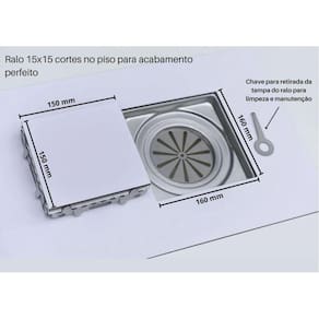 Ralo quadrado oculto 15cm x 15 cm inox304Ideal para banheiros, terraço, duchas, cozinha industrial, áreas externas e internas.Obs: o ralo não e sifonado deve ser ligado direto a uma caixa sifonada ou a tubulação de 100mm ou 150 mm, ligada na caixa sifonada.Acompanha:1- telinha de proteção para evitar a passagem de insetos2- uma chavinha para retirada da tampa.Base de 16cm x 16cm com aba de 1cm de cada ladoAltura de 2,8cm da base até o nível acabado do pisoDa base até o nível acabado do pisoInstruções para instalação2- o ralo possui saída com encaixe tubo 100mm e 150mm3- suporte interno de 10x10O produto é fabricado em inox 304