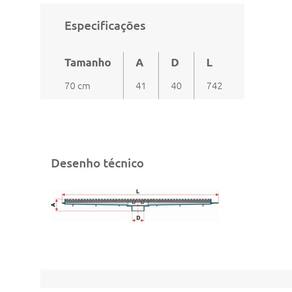 Função: Coletar águas servidas para condução à caixa sifonada; Aplicação: Áreas de piso como box de banheiros, lavanderias, sacadas e outros pontos onde se faz necessário escoamento de água. Matéria prima: corpo em PVC; Grelha vazadas em ABS Medidas: 50mm x 708,80mm x 72mm (AxLxP) Vazão: 0,55 L/s