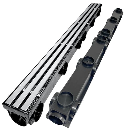 O conjunto Grelha Pluvial 8x100 é formado por: 1 - Grelhas modelo 8 Cm x 98 Cm inox 304 1 - Coletora Plástica Saída Linear/Lateral e Baixa ( 20 Saídas) na configuração 12 Saídas para conexão em ângulo de 90 graus – encaixe 50mm 2 Saídas Lineares ( sequencial macho / femea ) – encaixe 50mm 6 Saídas para Baixo – Encaixe dentro do Tubo de 50mm