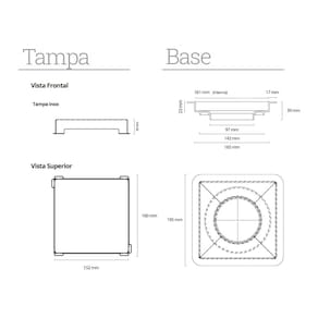 Especificações Gerais do Produto: Dimensões AxLxP (mm)Base: 23x195x195; Tampa: 30x152x152Cor: InoxMaterial: Base em PVC e Tampa em Aço Inox 304Garantia: 5 anos junto ao fabricanteReferência: 210Linha: SquareFormato: QuadradoCompatibilidade: Acoplável a caixas sifonadas de 100mm e 150mm e compatível com tubo de 50cmFecha Ralo (previne o retorno de insetos pela tubulação): SimSaída: Saída Central VerticalGrade Retentora (previne entupimentos na tubulação de esgoto): SimAbas para prevenir infiltrações: SimSugestão de Uso: Ideal para salas de banho, banheiros em geral, lavação ou áreas de serviço e reformas.Base com altura reduzida: Permite a instalação no contrapisoQueda Interna: Sim (ajuda a água fluir naturalmente para saída do ralo seco)Tipo: SecoLocal de Uso: Interno O que vem na caixa:1 Base do ralo em PVC1 Tampa removível de Aço Inox 3041 Grade Retentora1 Kit Fecha Ralo Square1 Ventosa para remoção da tampa