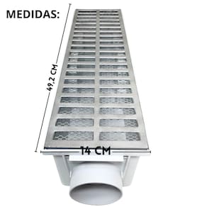 Marca: FICONE REIS Linha: Grelha com Coletor Conect Medidas: 14 Cm de largura X 49 Cm de comprimento x 11,5 cm Altura Modelo: 15x50 Sequencial Conect Material: Aluminio e Plástico