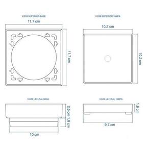 1 - Base 11,7 cm x 11,7 cm x 4,5 cm . 2 - Suporte para o revestimento 10,2 cm x 10,2 cm x 1,6 cm . 3 - Tela anti insetos/resíduos