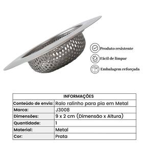 O Ralo ralinho para pia de cozinha e lavanderia 9cm em Metal, evita a queda de resíduos e restos de alimentos impedindo o entupimento de canos. Basta colocá-lo antes de usar e assim que estiver com algumas sobras retire-o jogue as sobras no lixo, enxague e estará pronto para usar novamente. Informações importantes; Medidas aproximadas - 9 x 2cm Dimensão x Altura Medidas aproximadas da boca - 5,5cm Dimensão Composição - Metal Validade - Indeterminada Mais Informações; Para manter seus utensílios sempre brilhando, lave com esponja macia, sabão ou detergente neutro. Produtos abrasivos como palha de aço podem riscar e prejudicar o brilho Seque imediatamente para evitar manchas Recomenda-se o uso de água quente para melhorar o brilho Não guarde em local úmido, a umidade pode provocar manchas. Lave com bucha macia e detergente neutro Após a limpeza, enxugue imediatamente para evitar formação de manchas. Ralo ralinho para pia de cozinha e lavanderia 9cm em Metal