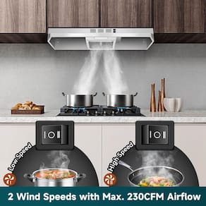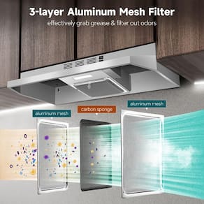 - ?Capô sem ventilação?Este exaustor sob armário padrão é ventilação sem dutos, inclui um filtro com esponja de carbono (peça # CF-3976), sugerimos substituí-lo a cada 3-6 meses com base na condição da sua cozinha para garantir a eficácia da sucção