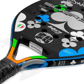 - Detalhamento: Possui uma pintura com jateamento rugoso promovendo uma melhor performance de alguns golpes como smash e saque, furos espalhados somente ao redor do centro da raquete sendo: 15 furos maiores e 8 furos menores, acompanha capa protetora;
