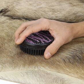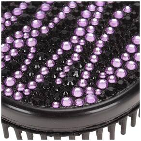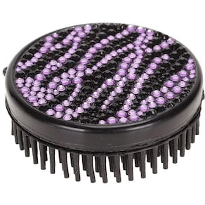Raspador importado Partrade modelo escova, fabricado em plástico de alta resistência com cerdas de borracha macia, ideal para massagear e limpar o pelo do animal. Parte superior com brilhantes pedras de acrílico nas cores preta e lilás e glitter preto formando estampa em zebra.