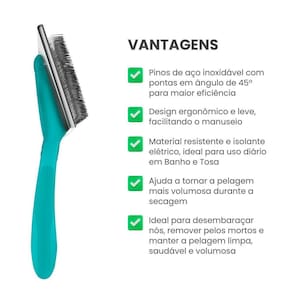Rasqueadeira Grande Reta Clássica Propetz Cabo Azul DESCRIÇÃO: A Rasqueadeira Grande Reta Clássica Propetz é a escolha ideal para profissionais e tutores que buscam eficiência e conforto ao cuidar da pelagem de animais com pelos médios ou longos. Com design inovador e materiais de alta qualidade, ela proporciona escovação eficaz, remoção de pelos mortos e desembaraço de nós com menos esforço. Sua estrutura resistente e cabo emborrachado garantem firmeza e suavidade durante o uso. ESPECIFICAÇÕES TÉCNICAS: - Marca: Propetz - Peso: 96g - Material: Plástico ABS com chapa e pinos de aço inoxidável - Cabo: Emborrachado para maior conforto e firmeza - Dimensões: 2cm x 11,5cm x 18cm - Referência: E1CGA-200 CARACTERÍSTICAS: - Pinos de aço inoxidável com pontas em ângulo de 45º para maior eficiência - Design ergonômico e leve, facilitando o manuseio - Material resistente e isolante elétrico, ideal para uso diário em Banho e Tosa - Ajuda a tornar a pelagem mais volumosa durante a secagem INDICAÇÃO DE USO: Indicada para cães e gatos de pelagem média ou longa. Ideal para desembaraçar nós, remover pelos mortos e manter a pelagem limpa, saudável e volumosa. MODO DE USO: 1 - Passe a rasqueadeira gentilmente na direção do crescimento da pelagem. 2 - Repita o processo até que os pelos estejam totalmente desembaraçados. 3- Durante a secagem, utilize a rasqueadeira para deixar o pelo mais volumoso. Use com cuidado para evitar pressão excessiva na pele do animal. : CONTEÚDO DA EMBALAGEM: 01 Rasqueadeira Grande Reta Clássica Propetz Marca: Não Informado