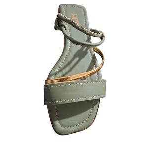 Mix de Texturas: A união da tira larga verde com o detalhe fino dourado valoriza o pé.
