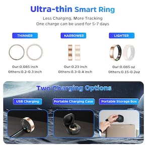Monitoramento de integridade de precisão: o anel inteligente é um anel de fitness/anel de saúde inteligente/anel rastreador de sono, o rastreador de saúde do anel inteligente está gravando frequência cardíaca, passos, distância, monitoramento de calorias, usando tecnologia avançada de gestos de ar, você pode tocar a superfície do anel, deslizar para controlar o Tik tok para virar páginas para cima e para baixo, tirar fotos e vídeos remotamente, jogar, virar páginas de e-books etc., desfrute de uma experiência interativa mais conveniente - Confortável de usar e à prova d'água: após esforços contínuos e inovação, a espessura desta nova geração de anel de saúde vital ultrafino para mulheres e homens é 0,2 cm, o que é 0,1 cm mais fino do que os outros, a largura desses anéis inteligentes para homens é de 0,6 cm, que é 0,2 cm mais estreito do que outros anéis inteligentes, e é muito confortável de usar, o anel de saúde é à prova d'água e feito de materiais de alta qualidade. garantindo que ele possa lidar com tudo de exercícios a chuveiros. - Monitoramento de precisão do sono: estes anéis de saúde ultrafinos para mulheres e homens também podem monitorar automaticamente seu sono. Este anel rastreador de sono permite que você visualize dados de sono diários, semanais e mensais no aplicativo. Melhore a qualidade do seu sono com relatórios detalhados sobre sono profundo, sono leve, movimento dos olhos e número de despertares. - Rastreador de atividades físicas: os anéis de fitness para mulheres e homens rastreiam automaticamente várias atividades, servem como um rastreador de fitness abrangente, mantenha seus objetivos de fitness no caminho certo monitorando seus passos, tempo esportivo, frequência cardíaca, calorias queimadas, distância ao longo do dia e níveis de atividade. O anel fitness ajuda você a se manter motivado e ativo. - Monitoramento holístico de saúde: monitore sua saúde sem esforço com este anel inteligente fino, anel de saúde vital para mulheres e homens, que monitora a qualidade do sono 24 horas, níveis de atividade 24 horas, frequência cardíaca de 24 horas, saturação de oxigênio no sangue 24 horas e queima diária de calorias. O anel rastreador de sono fitness pode ficar no topo da sua forma física e bem-estar geral. - Bateria de longa duração: o anel inteligente ultrafino para mulheres e homens usa tecnologia avançada de carregamento sem fio, depois que o rastreador de sono estiver totalmente carregado, pode ser utilizado continuamente por até 5 a 7 dias. O estojo de carregamento portátil é bom e ideal para viajantes de negócios frequentes e entusiastas de atividades ao ar livre, garantindo monitoramento contínuo da saúde, não importa onde você esteja. Seja um aniversário, Dia dos Namorados, Dia das Mães, Dia dos Pais, Ação de Graças ou Natal, anéis de fitness para mulheres são uma escolha prática e significativa.