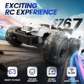 DEERC Carro de controle remoto, caminhão monstro com 2 baterias para 40 minutos de jogo, todo-o-terreno 2,4 GHz Rock Crawler brinquedo presente para meninos meninas crianças iniciantes - ?Carro RC é uma escolha fantástica para iniciantes? ostentando um design de caminhão vibrante e elegante. É equipado com uma asa traseira resistente, feita de material moldado por injeção, para melhorar a força descendente. Além disso, seus amortecedores dianteiros oferecem proteção contra colisões. O chassi composto deste carro é habilmente trabalhado para fornecer um equilíbrio perfeito de força, peso e desempenho. - ?Compacto, mas robusto?Este caminhão RC em escala 1/20 pode ser pequeno, mas é notavelmente potente, com seu motor escovado capaz de velocidades acima de 11 km/h em condições ideais. O veículo possui quatro amortecedores de metal que suavizam eficientemente terrenos irregulares, garantindo uma experiência de condução dinâmica e estável. Os pneus todo-o-terreno, projetados com um piso ousado e robusto, proporcionam aderência excepcional em uma variedade de superfícies. - ?Tempo de reprodução prolongado de mais de 40 minutos?Experimente a emoção de dirigir por aproximadamente 40 minutos ou mais com duas baterias recarregáveis de alta capacidade de 500 mAh. Este conjunto inclui um cabo de carregamento USB para facilitar a conexão, carregar e jogar! - ?Sistema de rádio DEERC 2,4 GHz? Este sistema de rádio avançado de 2,4 GHz oferece controle confiável em um longo alcance de até 80 metros. Permite que vários jogadores participem simultaneamente. Reúna seus amigos e mergulhe na diversão das aventuras de RC juntos. - ?Caminhão monstro perfeito para iniciantes? O S767 é fácil de usar e pronto para ser utilizado direto da caixa, tornando-o um presente introdutório ideal para jovens entusiastas. Por que não convidar um amigo e começar sua própria série RC Truck Racing? Dê zoom através de voltas e reviravoltas, voe sobre saltos e corra para a linha de chegada!
