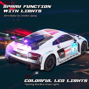 Audi R8 LMS GT3 oficialmente licenciado da série RC com fluxo de neblina traseiro. O carro de corrida pode pulverizar uma névoa de água colorida com água em seu tanque e você pode adicionar água com o conta-gotas que vem com o carro RC. Com fluxo de neblina traseiro e efeitos de luz, o carro RC pode proporcionar a você e seus filhos uma experiência visual mágica. Uma bateria de carro totalmente carregada pode durar 80 minutos. O carro de corrida 2WD com pneus de borracha lhe dará a tração de que você precisa no ápice! Esse longo tempo de duração pode realmente fazer com que a diversão continue sem qualquer interrupção. Seus filhos podem levá-lo sem se preocupar com a cobrança. Quando você liga o carro RC e começa a rodar, você pode ouvir o som realista do motor; parece que você está realmente sentado no carro. E você pode pressionar o botão no controlador para obter uma música dinâmica muito legal.