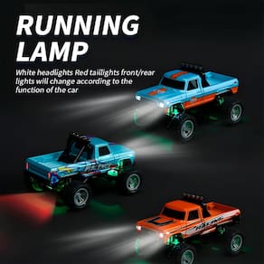 -?Faróis e lanternas traseiras embutidos para realismo?Equipado com luzes dianteiras e traseiras, este caminhão RC oferece uma experiência de direção autêntica. Faróis brancos brilhantes e luzes traseiras vermelhas se adaptam às ações de direção, criando uma aventura realista, não importa onde você jogue, mesmo com pouca luz.
