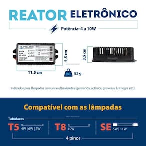 Os reatores eletrônicos da pollaris são os mais indicados para as lâmpadas ultravioletas (germicida, actínica, grow, luz negra etc.) ou para lâmpadas comuns de quatro pinos. São de fácil instalação e geram uma economia de 30% em comparação aos reatores eletromagnéticos.