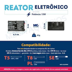 Compatibilidade: Modelos de lâmpadas: t5 t8 se pl Quantidade de pinos na lâmpada: 4 Potência da lâmpada: 15w 16w 18w Tipos de lâmpadas: Comum e ultravioletas: Branca luz do dia Uva actínica, mata mosca - bl Uvb grow - luz rosa Uvc ultravioleta c - germicida - gl Luz negra efeito neon - black light blue - blb .