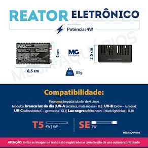 Características: Indústria nacional Seguro Compacto Modelo ideal para ligar lâmpada ultravioleta germicida Reator eletrônico para acender uma lâmpada Para lâmpada de 4 pinos fluorescente Partida instantânea 30% mais econômico em relação aos modelos eletromagnéticos Maior eficiência e durabilidade para as lâmpadas Não é a prova dágua