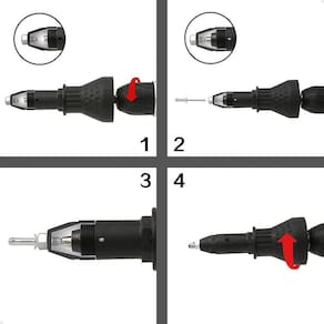 Antes de trocar a ponteira do adaptador de rebitador, certifique-se de remover a haste do rebite anteriormente utilizado. Para remover a haste, basta reverter o giro da parafusadeira. Se estiver usando uma furadeira, verifique se ela possui modo de reversão da rotação, pois isso é imprescindível para realizar a remoção da haste com segurança.