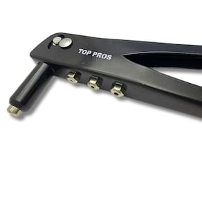 Rebitadeira manual alicate de rebites 10 pop 4 bicos 2,4 / 3,2 / 4,0 / 4,8mm aço carbono 26cm - alicate de rebites 10 polegadas - comprimento do alicate: 250mm - material do cabo: plástico - material da cabeça: aço carbono - tamanho dos bicos: 2,4mm / 3,2mm/ 4,0mm/ 4,8mm - diferencial do produto: robusto O alicate de rebites é feito em aço carbono e plástico, com chave de troca inclusa. Possui mecanismo Que aperta o rebite em outra estrutura fazendo a união delas, de forma segura. É na indústria, construção e em projetos de bricolagem, cirando conexão permanente Entre materiais como metal, plástico e couro, de maneira simples e prática. Útil em projetos em que se tem acesso a um dos lados. A marca top pros é reconhecida pela excelência na qualidade e praticidade dos seus produtos. Ela faz parte de um grupo de outras marcas já fortemente reconhecidas no ramo de persianas, decoração, Bazar e utilidades domésticas e agora traz o seu conhecimento na área das ferramentas. Dúvidas frequentes: 1. Como manter meu alicate em boas condições R: limpe-o após o uso, lubrifique a articulação regularmente, e armazene em local seco. 2. Existem diferentes tamanhos de alicates de rebites R: sim, há uma variedade de tamanhos de alicates de rebites disponíveis para atender uma ampla gama De diâmetros e comprimentos. Escolha o tamanho apropriado com base no tipo e tamanho dos rebites que pretende usar. 3.Quais cuidados ao manusear R: utilize com precaução. Mantenha fora do alcance das crianças. Marca: Não Informado Ean: 7898513849963